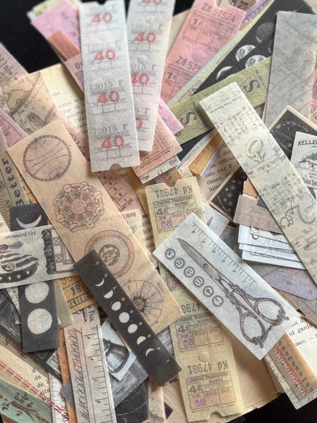 資材は100点数以上入っています。ダイカット、エフェメラ、厚紙カード、ステッカー、コーヒー染め紙、タグ、Tim Holtzエフェメラetc